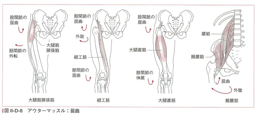問73 股関節および大腿部の構造と機能について誤っているのはどれか。2つ選べ。