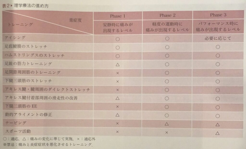 c.安静時痛が残る時期のリハビリテーションは、下腿三頭筋のストレッチングを実施し患部の筋力強化は控える。